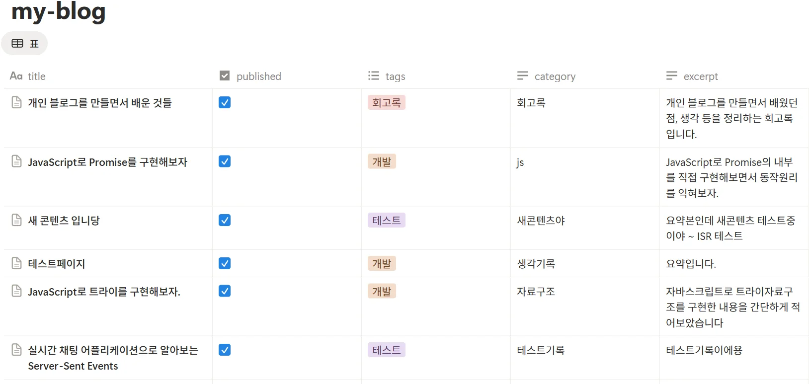 이 방식 덕분에 글을 쓰는 환경과 여러 콘텐츠에 대한 관리(임시 작성용이라던지, 수정 중인 콘텐츠)를 Notion 내에서 바로 해결하여 Headless CMS 환경을 구축할 수 있었다.