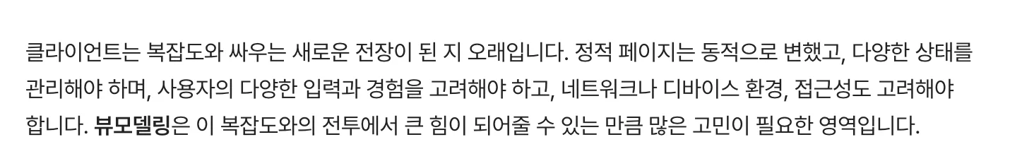 최근에 강남언니의 기술블로그에서 [SaaS] 왜 우리는 뷰모델링을 중요하게 생각하는가 라는 글을 읽었는데 위와 같은 내용이 나온다.