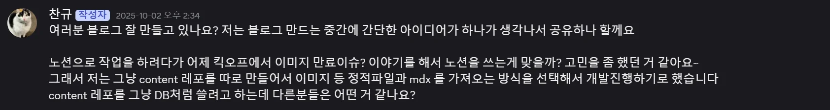 그리고 준형님이 알려주신 하조은님의 “Vercel 기술 블로그 아키텍처 뜯어보기” 영상이 정말 큰 도움이 됐다.
