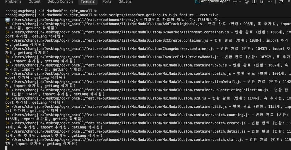 node transform-i18n.js src/components --recursive이를 위해 CLI 옵션으로 --recursive 플래그를 추가해 지정한 디렉터리 하위의 모든 파일을 재귀적으로 순회하며 변환하도록 했다.