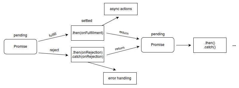 Promise는 비동기 흐름을 직관적으로 이어주는 도구이다. 먼저 위 그림에서 확인하면 Promise가 생성되면 처음엔 항상 pending 상태이다. 그이후 작업이 끝나면 fulfilled(성공), 아니면 rejected(실패)로 settled된다.